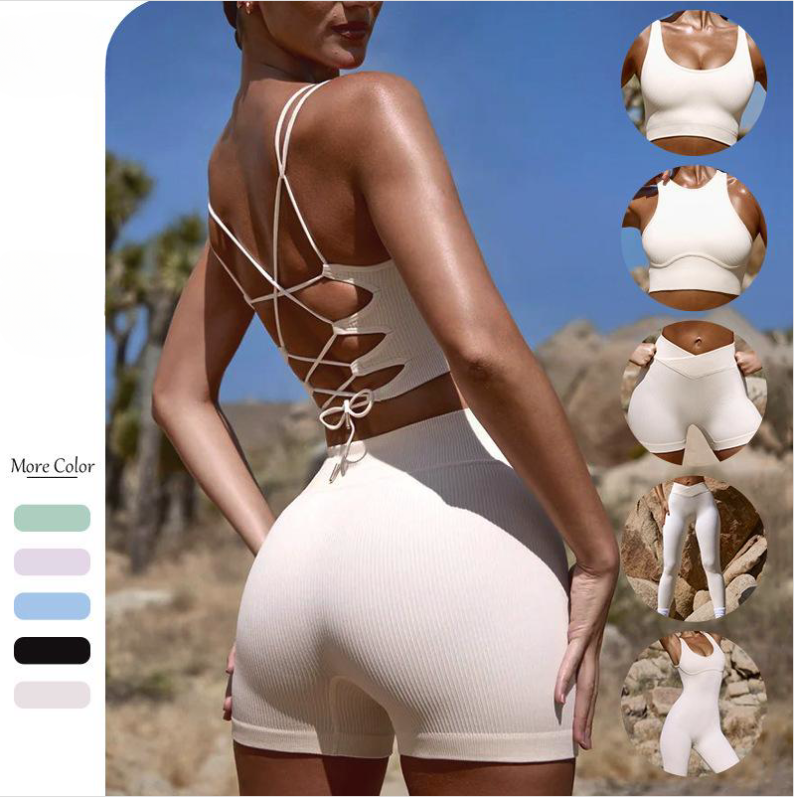 V&J High Elastic Fitness Outfits Workout Set Yoga Gym Shorts and Crop Top...